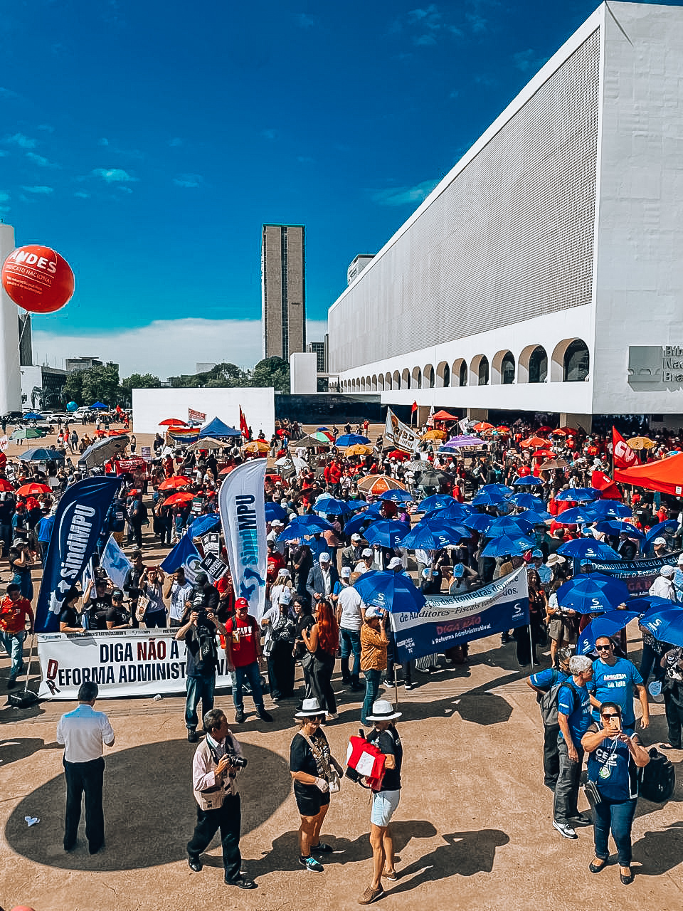 Milhares de Servidores Públicos de todo o Brasil estiveram em Brasília nesta quarta, dia 29 de outubro, em uma grande mobilização nacional contra a Reforma Administrativa e demais ataques ao funcionalismo. A Marcha Nacional do Servidor Público, realizada na Esplanada dos Ministérios, reuniu centenas de lideranças sindicais, federações, associações e centrais, unidas na defesa do serviço público e na conscientização da sociedade sobre os riscos representados pela PEC 38.