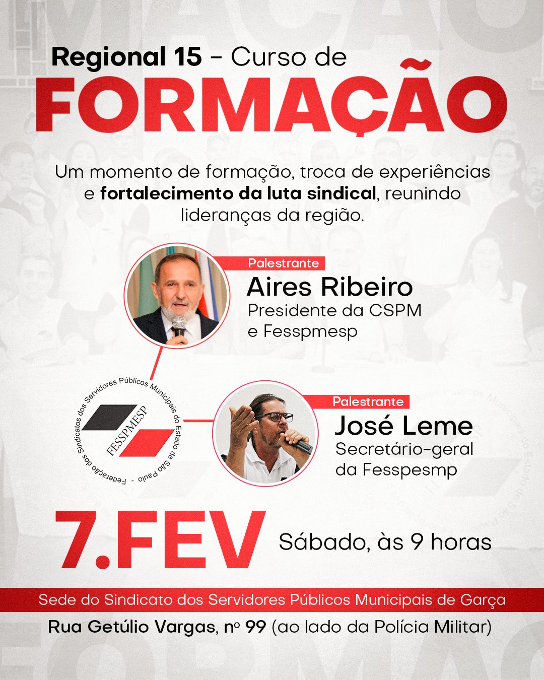 Regional 15 | Curso de Formação Sindical vai reunir lideranças sindicais em Garça/SP. Será dia 7 de fevereiro, às 9 horas. Participem!