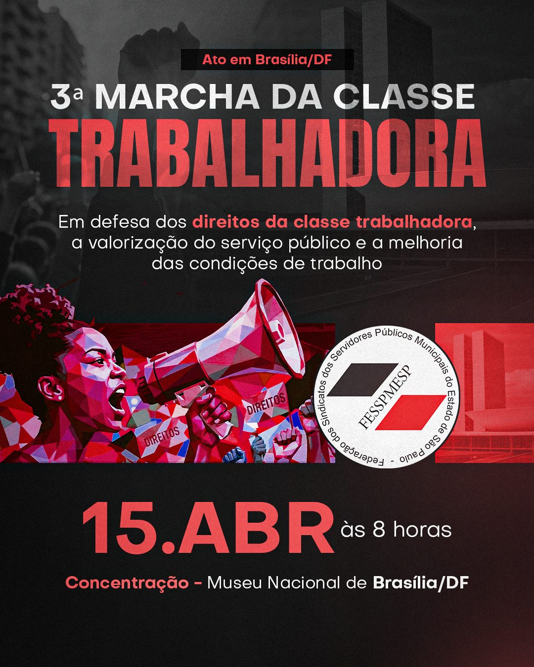Na defesa dos Servidores Públicos, dos direitos dos trabalhadores e de um País mais justo para todos, nossa Federação convoca todos os Sindicatos Filiados para a 3ª Marcha da Classe Trabalhadora, dia 15 de abril, às 8 horas em Brasília – com concentração no Museu Nacional, (SCTS Lot 2, Plano Piloto, Brasília – DF).