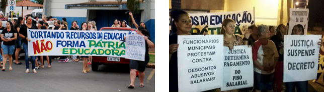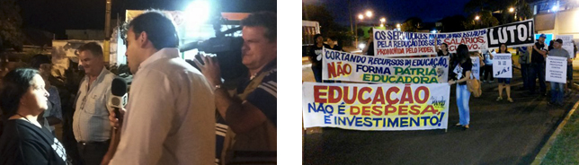 MANIFESTAÇÃO - Em resposta ao descaso da prefeitura, cerca de 80 Servidores do ensino realizaram, dia 17 de agosto, no período da tarde, uma manifestação em frente ao Ginásio de Esportes da cidade. Durante cinco horas, com apoio de nossa Federação, os trabalhadores distribuíram informativos sobre a injustiça com a classe para os membros da comunidade local e com caminhão de som e cartazes, solicitaram soluções da administração.