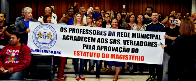 No último dia 20 de agosto, os trabalhadores do ensino puderam comemorar mais uma vitória conquistada pelo Sindicato dos Servidores Públicos Municipais de São Vicente (SindServsv). Após quinze anos de luta e incansáveis pesquisas, o Estatuto do Magistério foi aprovado na Câmara.