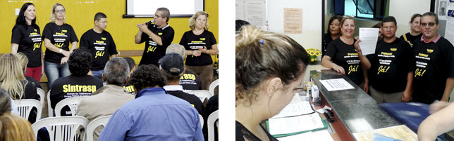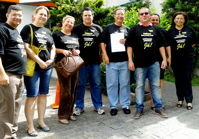 | Diretores do Sintrasp foram com camisetas revindicar a aplicação da lei federal que garante o extraclasse |