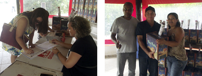 | Visitantes preencheram lista com dados cadastrais e receberam a cesta em seguida. Distribuição continua |