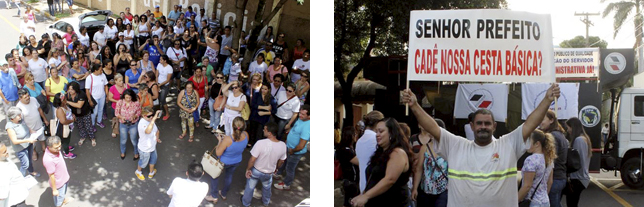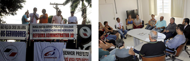 | Servidores protestam contra falta de repasse dos benefícios. Lideranças reuniram-se com prefeito por soluções |