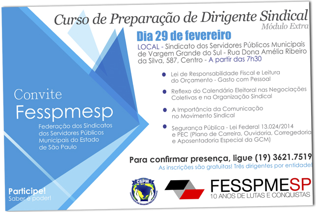 Vamos nos reunir no Sindicato dos Servidores Públicos Municipais de Vargem Grande do Sul, que fica na rua Dona Amélia Ribeiro da Silva, 587 - Centro, a partir das 7h30 para debates e apresentações de palestras com experientes defensores do funcionalismo. As inscrições são gratuitas e será permitida a participação de três dirigentes por entidade.