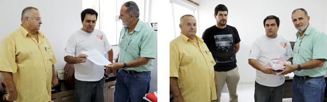 BRINDES EXCLUSIVOS - Além da Certidão, o presidente fez questão destacar seu apoio e entregar ao companheiro Chiquinho e também ao presidente do Sindicato de Canas, Tácito Satin, nossa agenda personalizada e o novo calendário de mesa que são os materiais comemorativos exclusivos, que marcam os 10 anos de ação da Fesspmesp. |