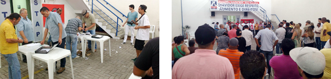 | À esquerda, os companheiros conferem as cédulas e à direita, nova diretoria agradece todo apoio recebido |