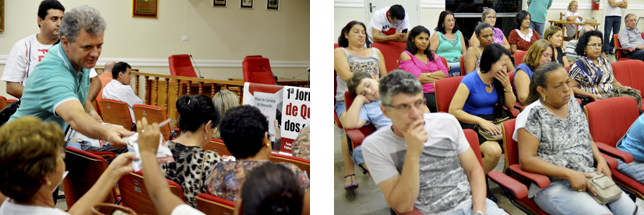 | Servidores, dirigentes e autoridades locais assistem palestra com muita atenção e recebem material impresso |