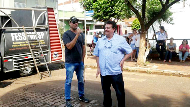 | Ronaldo Donizetti, presidente do Sindicato (centro), e Mauro Cirino, de Marília (microfone), orientam os grevistas |