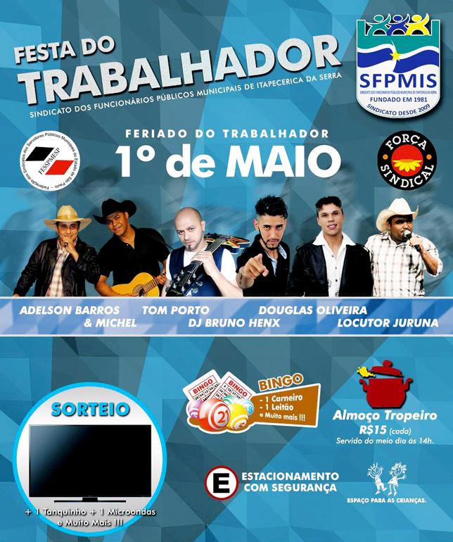Vem aí a Festa do Trabalhador do Sindicato dos Funcionários Públicos Municipais de Itapecerica da Serra. O evento será realizado no dia 1º de maio, com apoio da Fesspmesp e da Força Sindical.