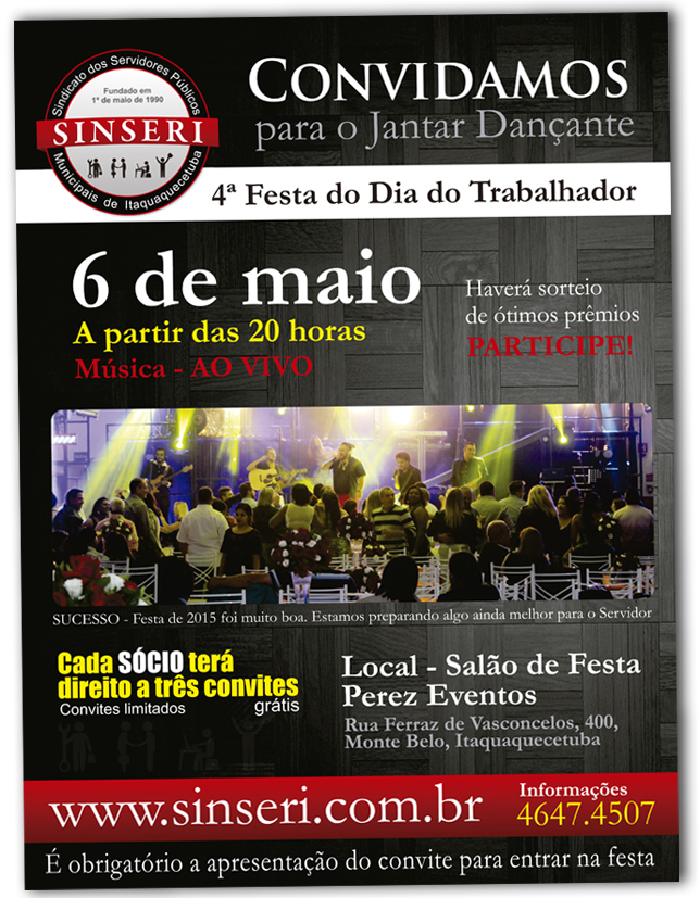 Com objetivo de reafirmar os compromissos com o funcionalismo e estreitar a relação com toda a categoria, além de proporcionar momentos inesquecíveis de confraternização e união, o Sindicato dos Servidores Públicos Municipais de Itaquaquecetuba (Sinseri) preparou um Jantar Dançante. Será dia 6 de maio, às 20 horas, no Salão de Festas Perez Eventos, que fica na rua Ferraz de Vasconcelos, 400, Monte Belo.