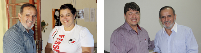 | Aires é bem recebido nas cidades por onde passou. À esquerda, Reinaldo, do Sindicato de Miguelópolis |