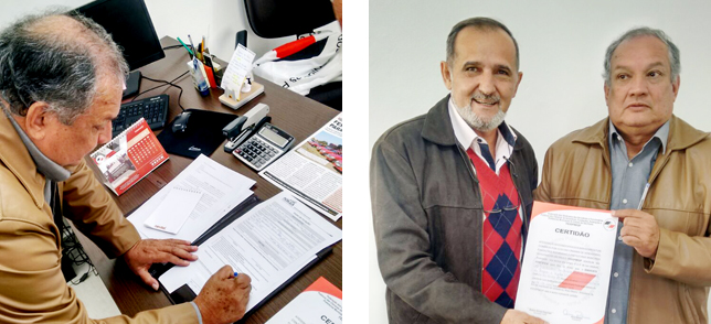 | À esquerda, Pedrassa assina ficha de filiação da Pública. Ao lado, Aires exibe orgulhosamente documento oficial |