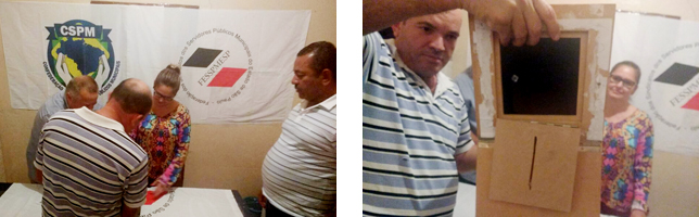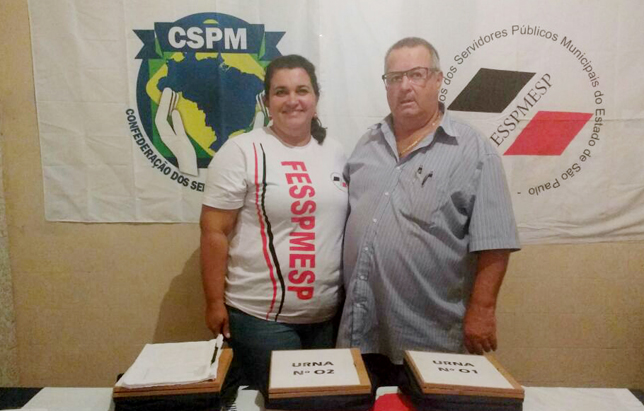 COLABORAÇÃO - Estiveram empenhados em manter a organização da eleição a equipe ténica e de eleições da Fesspmesp, coordenada pelo nosso tesoureiro Cláudio Aparecido dos Santos (Ted). As cidades presentes foram: Americana, Rancharia, Presidente Epitácio, Pacaembu, Maracaí, Cândido Mota, Suzano, Guarulhos, Itu, Tietê, Marília e Pontal. Nosso muito obrigado a todos pelo apoio!