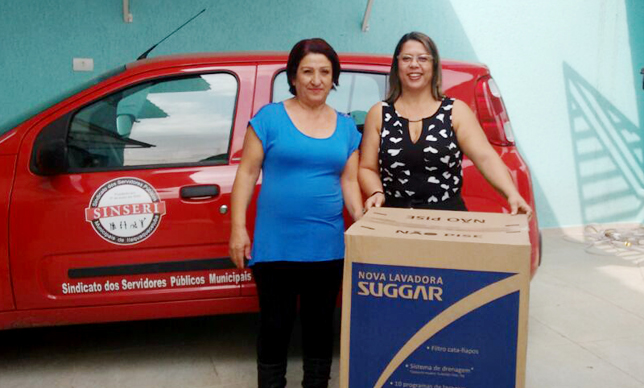 GANHADORES - O fogão Esmaltec foi entregue na residência do companheiro Anderson da Silva pelo segundo tesoureiro Cosmerindo Jardim da Silva (Coy). Já a lavadora Suggar foi retirada na sede da entidade pela Servidora Vera Lucia Ferreira Bernardo. Por último, o ganhador da geladeira, Luiz Carlos Magalhães, esteve no Sindicato e optou pela retirada do prêmio em dinheiro.