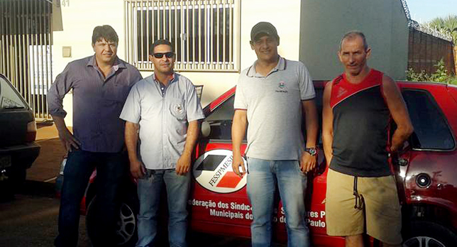| Companheiros em frente à sede do Sindicato. Parceria da entidade com a Federação garante mais força na luta |