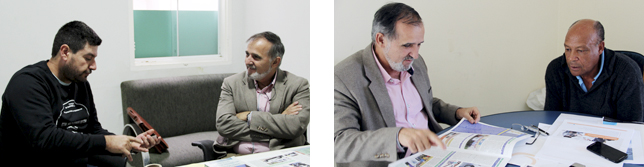 | À esquerda, dialoga com Tácito Satin (Canas); à direita, apresenta jornal da CSPM ao Daniel (Pindamonhangaba) |