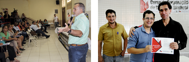 CURSOS - Os cursos idealizados pela Federação acontecem sempre nas quatro Macrorregiões lideradas pelos companheiros Basílio, Jesomar, Tadeu e Regina. Uma de cada vez é contemplada com temas relevantes para os participantes, como Plano de Carreira, Comunicação Sindical, Assédio Moral, Papel do Dirigente Sindical, etc. Isso amplia o conhecimento dos dirigentes participantes.