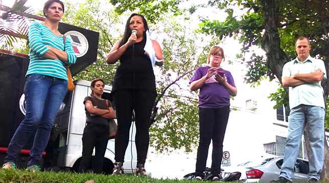 | Marinalva Lima (ao microfone) coordena, mais uma vez, a assembleia da categoria que deliberou a continuidade |
