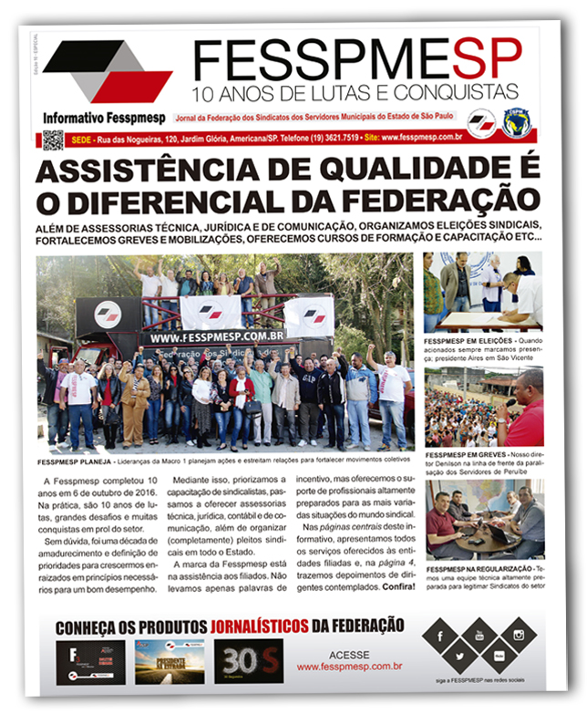 A Federação inicia nesta semana a distribuição da Edição Especial do Informativo Fesspmesp - 10 Anos de Lutas e Conquistas - para todas as entidades filiadas. O novo jornal contém quatro páginas e tem como propósito apresentar um resumo da assistência de qualidade prestada aos associados. Na prática, demonstra a preocupação em oferecer estrutura de amparo e desenvolvimento.