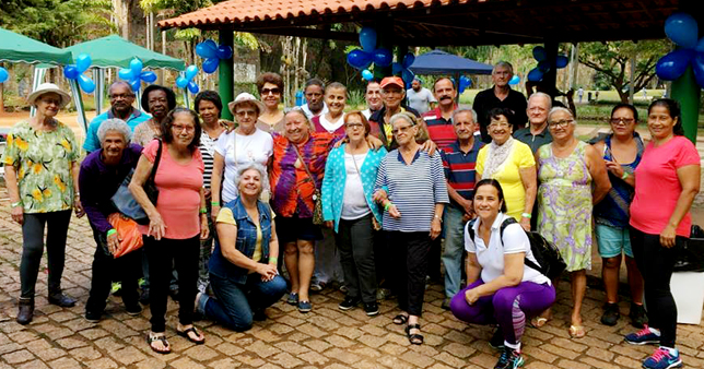 | Aposentados reunidos ao ar livre realizaram diversas atividades com objetivo de promover a saúde e bem-estar |