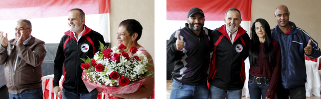 HOMENAGEM - Após as falas, a emoção tomou conta dos companheiros quando Vali foi agraciada pelo presidente Aires com lindo buquê de flores, a fim de representar a força e importância da mulher nesse período. A dirigente afirma: “Foram muitas dificuldades, tivemos muitos ganhos e algumas perdas, mas jamais, nunca, vou desanimar e deixar de fazer parte dessa grande e linda família”. |