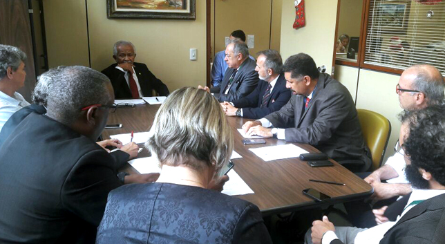 | Deputado Chico Lopes (na parte superior central da mesa) ouve os anseios das lideranças durante o encontro |