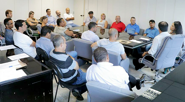 COMPROMISSO - O presidente da entidade, Alexander Munuera, e dirigentes do Sindicato estiveram reunidos com o prefeito Luiz Mauricio, os vereadores do município e a secretária da fazenda, Neusa Marinho, para discutirem sobre o reajuste da categoria. No encontro, Neusa expôs a dificuldade financeira da cidade. Contudo, o Sintrape irá lutar pelo ganho da categoria.