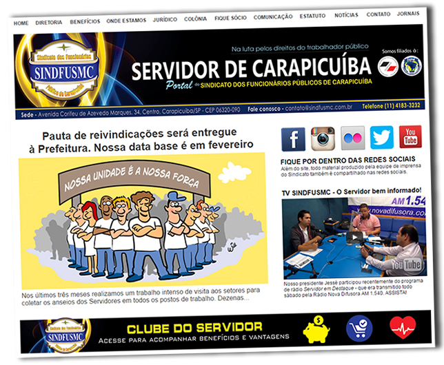 REPAGINADO - Desde ontem (16), está no ar o novo portal dos Servidores de Carapicuíba, projetado e pensado de maneira a oferecer informações relevantes para a categoria com a linguagem adequada e com a seriedade e comprometimento que o trabalhador merece. Além disso, a entidade agora está nas principais redes, como Facebook, Instagram, Flickr, Twitter e YouTube.