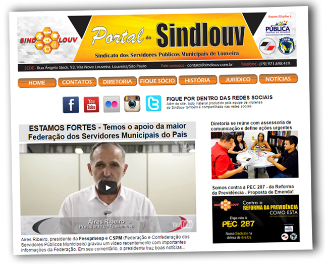 TEM MAIS - Além de uma página dinâmica e bem estruturada com fotos, notícias e vídeos, o Sindicato está presente nas principais redes sociais como Facebook, Instagram, Twitter e Flickr. Todas as ações, eventos e acontecimentos de relevância na entidade serão postados em matérias muito bem elaboradas com um único intuito: fazer o Servidor de Louveira participar ativamente da vida do Sindicato. Acesse www.sindlouv.com.br e confira as novidades da página.