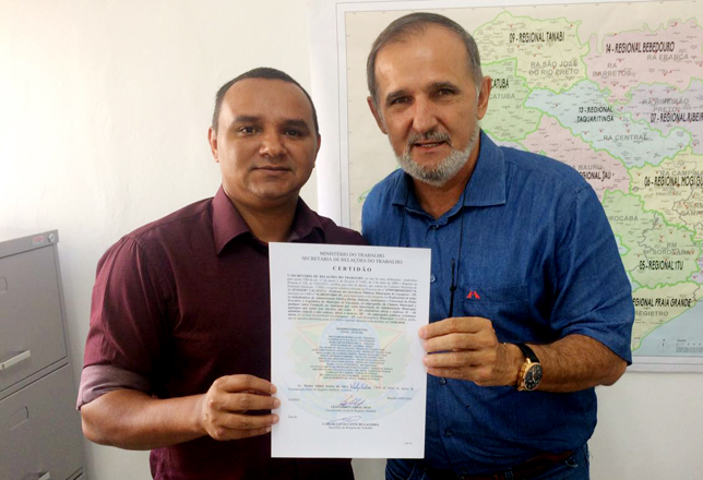 entidades filiadas que necessitam de apoio. Na manhã de hoje, dia 10 de março, mais um Sindicato foi agraciado com a Certidão Sindical, documento que legitima as ações em prol do funcionalismo. Estamos falando do Sindicato dos Servidores de Caçapava, que é presidido por Rivaldir Alves.
