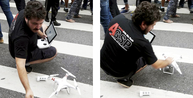| Guilherme Arsani, responsável pelo audiovisual da AGSP, coloca o drone para levantar voo no início do protesto |