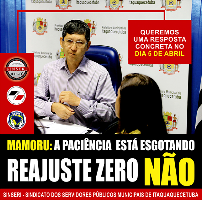 Os Servidores de Itaquaquecetuba não têm motivos para comemorar. Pelo contrário. Conforme nota divulgada pelo Sinseri (Sindicato dos Servidores da cidade), o prefeito Mamoru Nakashima pretende não dar nenhum reajuste para o funcionalismo. Isso mesmo: ZERO! Mediante a afronta, a entidade marcou reunião para o dia 5 de abril, no gabinete do prefeito, para novo e decisivo diálogo.