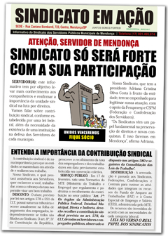 Em um material frente e verso e em cor a entidade explica que só serão fortes se houver a total participação do funcionalismo. Isso inclui a contribuição sindical, que corresponde a maior parte de toda a renda que o Sindicato conta para se manter (pagar conta de água, luz, telefone, impressos).