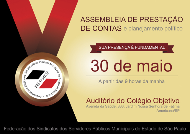 Convocamos os diretores da executiva para a assembleia de prestação de contas da Federação. Será realizada na terça, dia 30, no Auditório do Colégio Objetivo, que fica avenida da Saúde, 833, Jardim Nossa Senhora de Fátima, Americana/SP. Os dirigentes que integram nossa base de filiados também estão convidados a participar e acompanhar de perto os números do nosso atual trabalho.