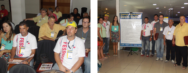 | Presença em peso - Entidades sindicais do Brasil, e de diversos países do mundo, apresentaram suas experiências e iniciativas. Nossa Federação foi representada por Araken Lunardi (Sumaré), Camila Moriyam (Leme), Cláudio Aparecido dos Santos, o Ted (Suzano), Edilson Humberto Lopes, o Ditinho (Boituva), José Flamínio Leme (Itu), Regina Leite (Martinópolis), Rubéns Romão (São Vicente) e Valdomiro Sutério (Mogi Guaçu). Na prática, o conhecimento adquirido no congresso será repassado aos demais dirigentes