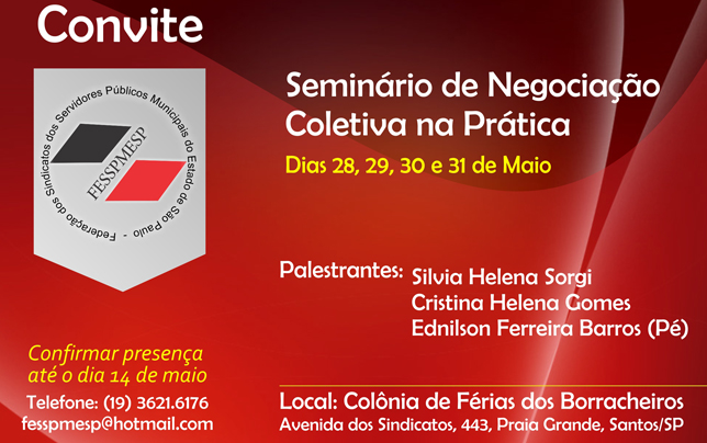 | A Fesspmesp convida todos os companheiros para o Seminário de Negociação Coletiva na Prática. Será nos dias 28, 29, 30 e 31 de maio, na Colônia de Férias dos Borracheiros, que fica na avenida dos Sindicatos, 443, Praia Grande, Santos/SP.
