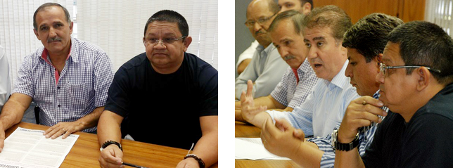 | Aires e o companheiro Tadeu antes das negociações; ao lado, dirigentes durante tratativas com o prefeito |