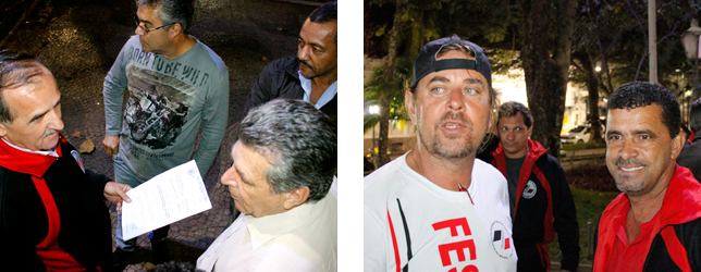 | Nossas lideranças Aires e Denilson durante assembleia com os Servidores de Itatiba, dia 10, na Praça da Matriz |