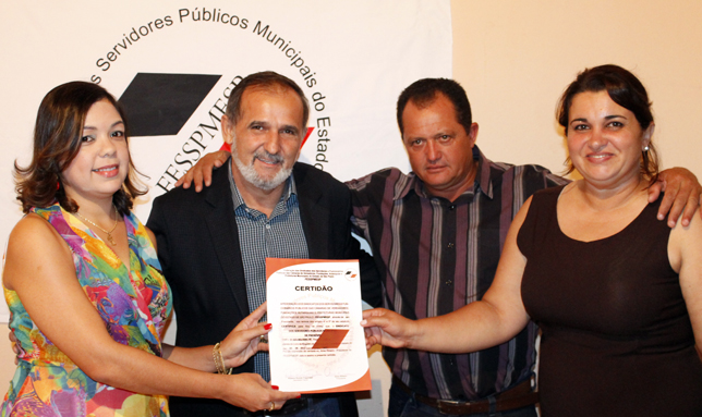 | O Sindicato dos Servidores de Pacaembu, presidido pela companheira Cristiane da Silveira, é o mais novo filiado da Fesspmesp. A entidade faz parte da Regional de Martinópolis, coordenada por Regina Leite, que junto ao nosso presidente Aires Ribeiro e o presidente do Sindicato de Junqueirópolis, Osvaldo dos Santos, foi até a sede do Sindicato, dia 14 de agosto, entregar o Certificado de Filiação.