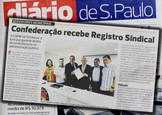 | A entrega da Certidão Sindical da nova Confederação dos Servidores Públicos Municipais (CSPM) repercutiu em toda mídia. Jornais e sites destacaram o ministro do Trabalho e Emprego, Manoel Dias, na sede da Força Sindical, na última segunda, dia 3 de novembro. Na ocasião, Dias entregou ao nosso presidente Aires, que também está à frente da Confederação, a Certidão que legitima a entidade como representante do Servidor público municipal.