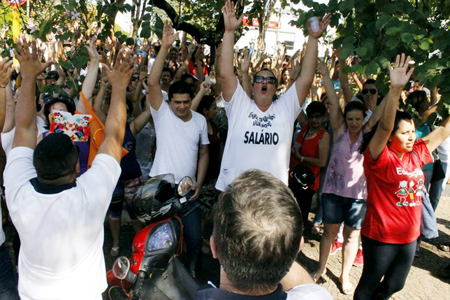 COMPROMISSO - O município se comprometeu a não atrasar a entrega das cestas básicas previstas para o dia 1º de dezembro, assim como o salário que vence em 5 de dezembro. As duas parcelas do 13º deverão ser quitadas nos dias 11 e 18 do mesmo mês. Fica mantido o estado de greve até 31 de dezembro. Os Servidores também irão indicar um representante para o cargo de secretário de Educação até a troca de prefeitos, em janeiro de 2015.