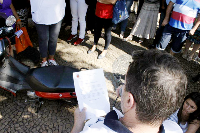 | Servidores vão em peso ao paço municipal. Ao fundo, nosso caminhão dá todo suporte e fortalece movimento |