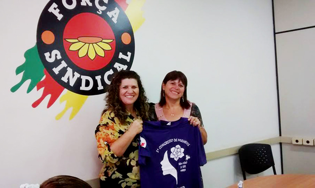 | Cláudia Adum entrega camiseta do último Congresso das Mulheres Fesspmesp, que ocorreu em agosto passado |