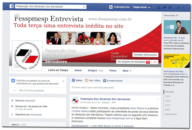 A Fesspmesp, com muita alegria, compartilha com os dirigentes e entidades filiadas os números da nossa rede social de maior destaque. No mês de maio, o perfil oficial da Federação no Facebook atingiu a marca de mais de quatro mil amigos. São Servidores, dirigentes sindicais do Brasil e do mundo e outras entidades de várias categorias que acompanham em tempo real nossas publicações e apoiam nosso trabalho.