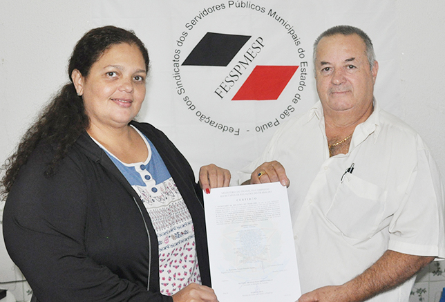 Com o apoio da nossa Federação, o Sindicato dos Servidores Públicos Municipais de São José Rio Preto recebeu, dia 19 de maio, a Certidão Sindical. A entrega ocorreu durante a eleição em Mauá (saiba mais), quando o tesoureiro da Fesspmesp, Cláudio Aparecido dos Santos (Ted), entregou o documento para a presidente da entidade, Sanny Lima Braga.