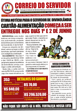 O SSMCDT (Sindicato dos Servidores Públicos Municipais de Caconde, Divinolândia e Tapiratiba) começou a distribuição de seu segundo informativo, Correio do Servidor. A edição, produzida pela Agência de Comunicação Grita São Paulo, destaca a conquista do cartão-alimentação, benefício inédito na cidade. A luta do companheiro Júlio César Pereira (Julião), presidente da entidade, tem garantido mais dinheiro no bolso do Servidor.