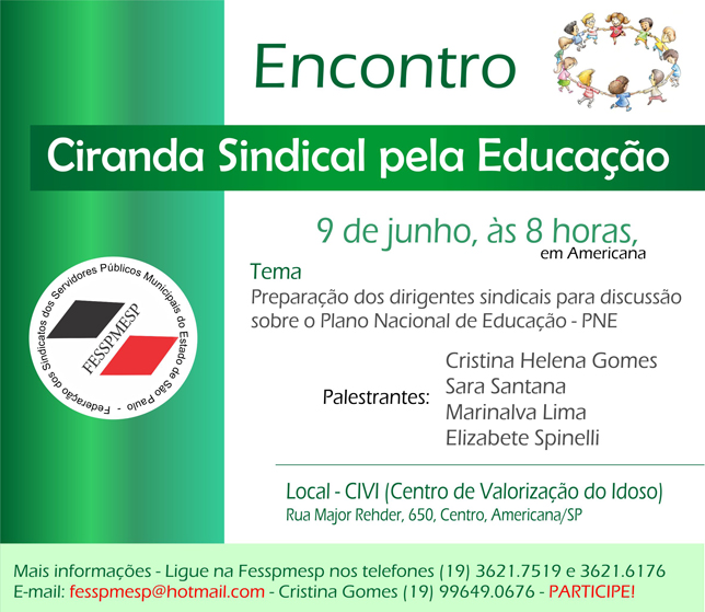 | A Federação convida todos dirigentes para a próxima edição da Ciranda da Educação. Será dia 9 de junho, numa terça, ás 8 horas, no Centro de Valorização do Idoso (Civi), que fica na rua Major Rehder, 650, Centro de Americana/SP. Entre os temas abordados destacamos a importância da articulação sindical para discussão na base sobre o Plano Nacional de Educação (PNE).