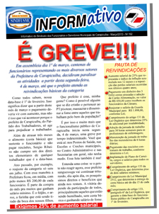 Em razão da intransigência do prefeito de Carapicuíba, Sérgio Ribeiro, que é do Partido dos Trabalhadores (PT), os Servidores iniciaram ontem, dia 4 de março, uma greve. Motivos: três meses de cesta básica atrasada e o não cumprimento da data base da categoria, que é 1º de fevereiro.