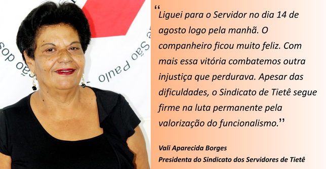 "Liguei para o Servidor no dia 14 de agosto logo pela manhã. O companheiro ficou muito feliz. Com mais essa vitória combatemos outra injustiça que perdurava. Apesar das dificuldades, o Sindicato de Tietê segue firme na luta permanente pela valorização do funcionalismo."